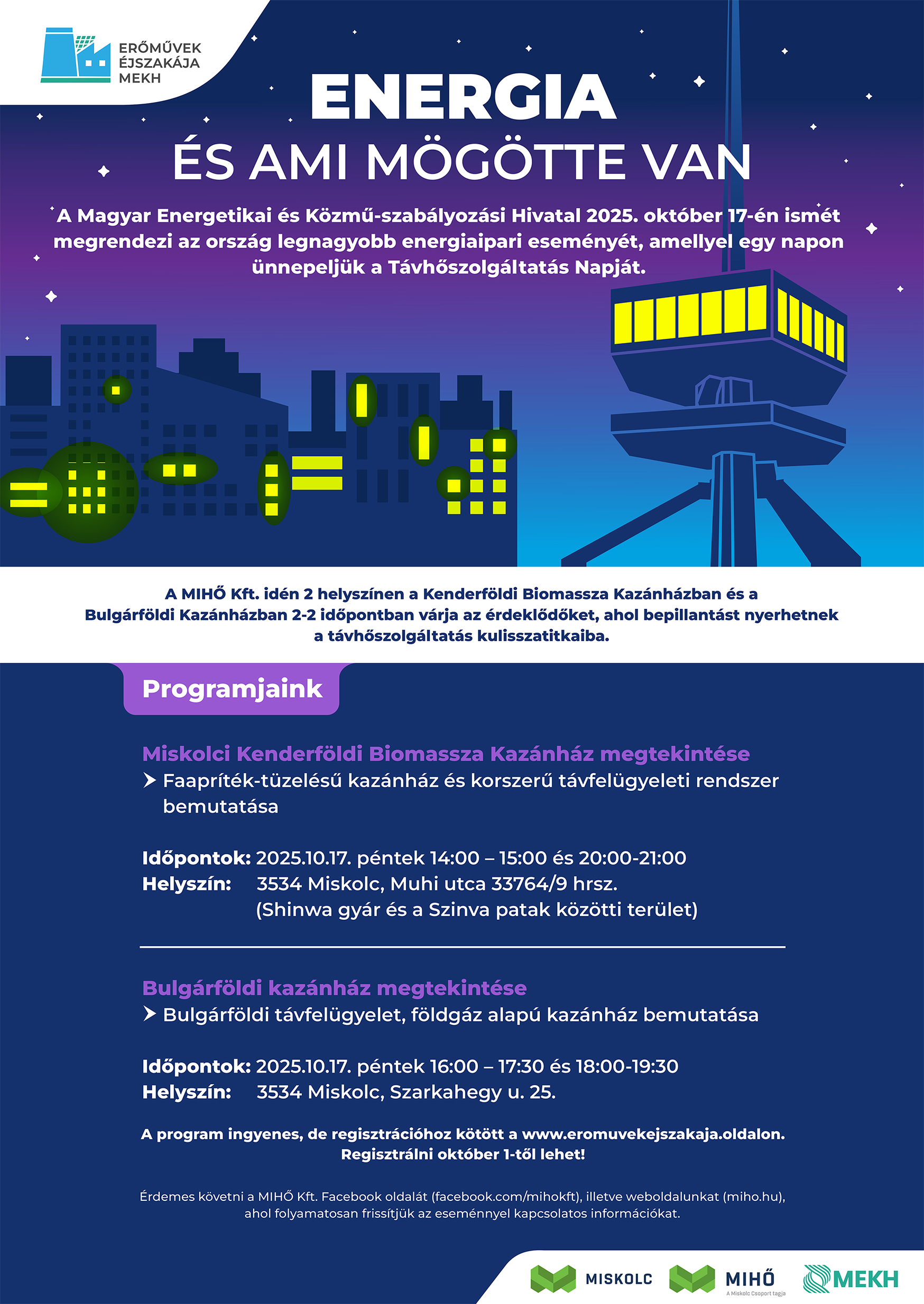 A MIHŐ Kft. idén 2 helyszínen a Kenderföldi Biomassza Kazánházban és a Bulgárföldi Kazánházban 2-2 időpontban várja az érdeklődőket, ahol bepillantást nyerhetnek a távhőszolgáltatás kulisszatitkaiba.
